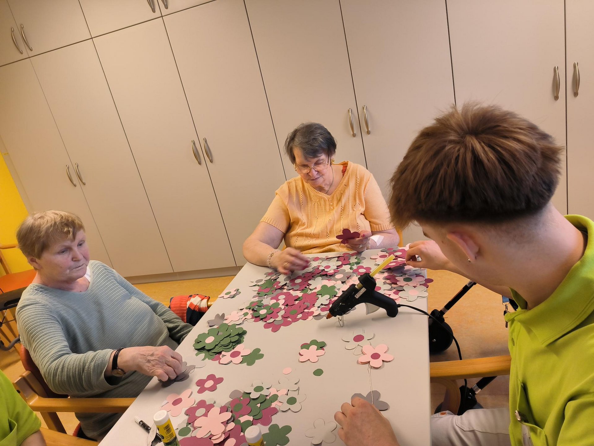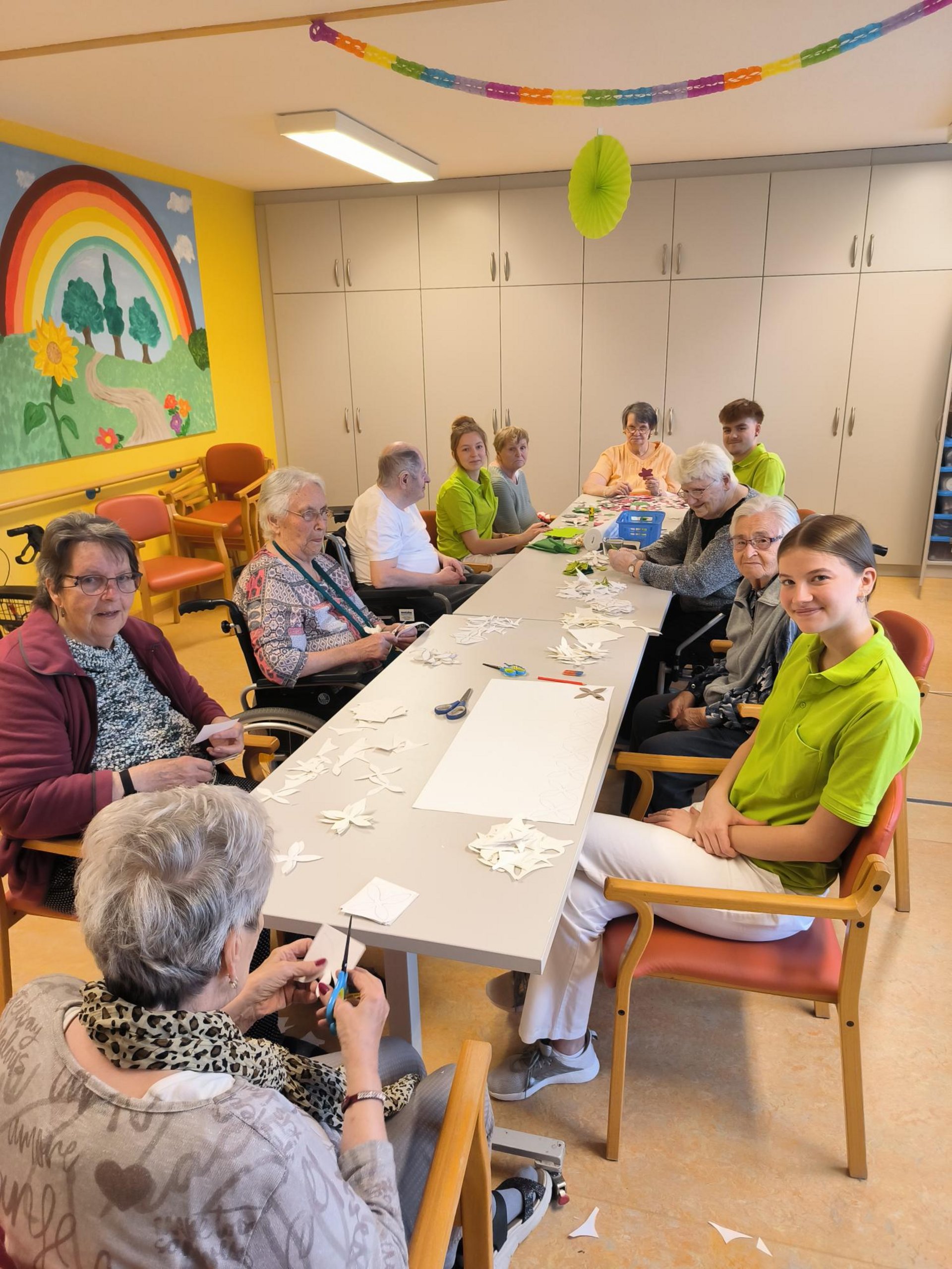 Auch für unseren Verkaufsstand wird fleißig Dekoration gebastelt. Mit Schere, Papier, Farben und vielen Ideen gestalten wir frühlingshafte und österliche Dekoelemente. Unser Angebot ist dabei besonders vielfältig: von schneiden, malen, vorzeichnen und kleben bis hin zu häkeln und falten - für jede Bewohnerin und jeden Bewohner ist etwas Passendes dabei.